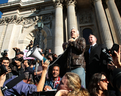 在伦敦金融城标志性的圣保罗大教堂(St.Paul’s Cathedral)广场上,数千名抗议者聚集,表达对“贪婪资本主义”的不满。集会者打出“我们是99%”的横幅,表达对占领伦敦金融城的决心。