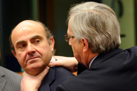 01 2012年3月12日,在欧元区财政部长会议期间,欧元集团主席容克突然从后面掐住了西班牙财政大臣金多斯的脖子,用开玩笑的方式表达了对西班牙财政政策的不满。 Virginia Mayo/人民图片