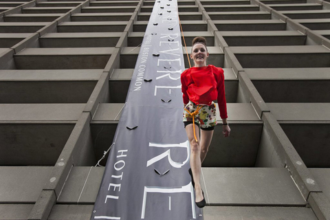 当地时间2012年4月18日,美国波士顿上演了一场别开生面的垂直时装秀。来自波士顿岩石健身房的攀岩者们,为观众展示了麻省艺术与设计学院的时装设计作品。他们表演的场地位于一家酒店的建筑外壁,表演者穿着时装作品“飞檐走壁”,让人叹为观止。