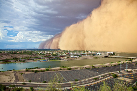 美国遭遇罕见沙尘暴天气,当地时间2012年7月21日,哈布沙暴席卷美国凤凰城,碧蓝的天空顿时顿时变成了暗红色,场面恐怖无比。据美国官方天气报告显示,此次沙暴高度约为600米,造成凤凰城机场封闭20分钟,有关部门没有收到人员伤亡报告。