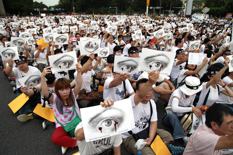 身穿白衣的台湾民众,在周六晚间,全台大串联,主办单位宣称,在“马办”前的凯达格兰大道集结的声援人数,已经突破二十万人大关,要送在军中遭虐死的,陆军下士洪仲丘,最后一程。
