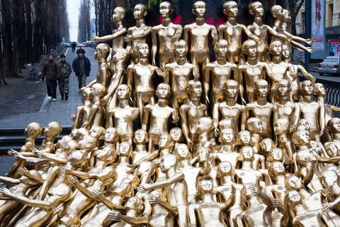 03 当地时间2月13日,乌克兰基辅,于2013年12月8日被砸毁的原列宁雕像被99尊金色人体模型取代。 NurPhoto/东方IC