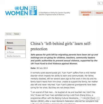小 学二年级女生圆圆的父母离开农村去城市务工后就再也没回来,因祖父母疏于照顾,圆圆多次遭受一名70岁男性性骚扰。为了保护中国这些脆弱的留守女童,联合 国妇女署出资,联合地方妇女保护组织,对超过2500名像圆圆这样的留守女童进行培训,让她们学习如何保护自己免受性侵。