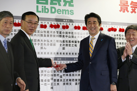 “国民对安倍政权这两年的表现给予了信任。”安倍晋三12月14日晚在接受媒体采访时说。尽管日本经济陷入技术性衰退,自民党用“只有这条路可走”此竞选口号,显示推行安倍经济学的意向。执政党自民和公明共获得全部475个议席中的326议席,超过三分之二。
