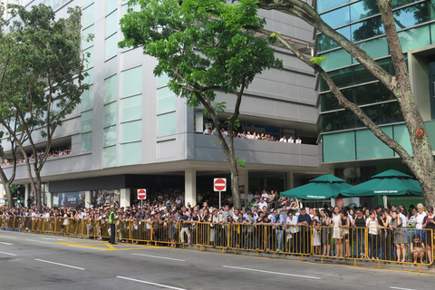 早上9时不到,财新记者乘坐汽车走访新加坡市中心,看到多数新加坡人隔着黄色路障站在路上,几乎没有空隙,有些人还向前探身。许多人穿着黑色衣服,有些人怀里抱花束或举起新加坡国旗,有不少白领不顾早间工作专门前来。