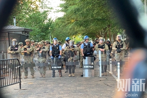 6月2日,财新记者前往白宫周围,发现周边街道已经封闭,白宫四周已筑起约三米高的围栏,防止抗议者靠近。在毗邻白宫的拉斐特广场周遭,仍聚集了众多抗议者,大部分的维安警力则在广场上分散而坐,现场依然可见抗议者前几天留下的涂鸦。而华盛顿街上,国民警卫队巡逻官兵的数量明显增多。据美联社6月1日报道,将有来自五个州的600─800名国民警卫队成员被派往华盛顿特区。