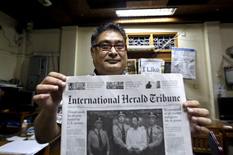 当地时间9月23日,缅甸仰光,工作人员展示《国际先驱论坛报》。该报纸成为了首份在缅甸印制发行的外国报纸。缅甸政府4月30日批准美国《国际先驱论坛报》按原版在缅甸印刷出版发行。这是缅甸首次批准外国英文报纸在缅出版。 NYEIN CHAN NAING/CFP
