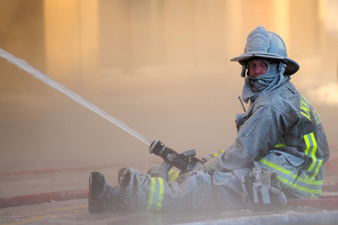 美消防员遭遇冰火两重天 一边灭火一边结冰