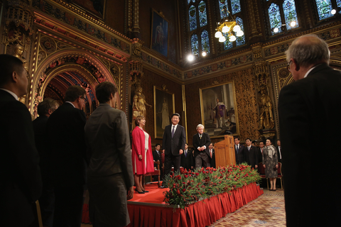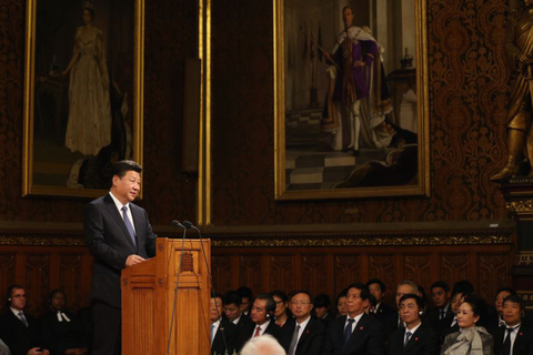 习近平指出,在我对英国进行国事访问的第一天,我深切感受到中英关系的蓬勃朝气,体会到两国人民的深厚情谊,使我对通过这次访问推动中英友好关系迈上新台阶充满期待。